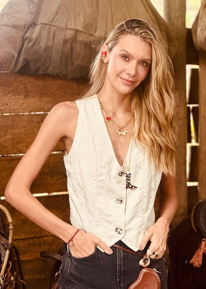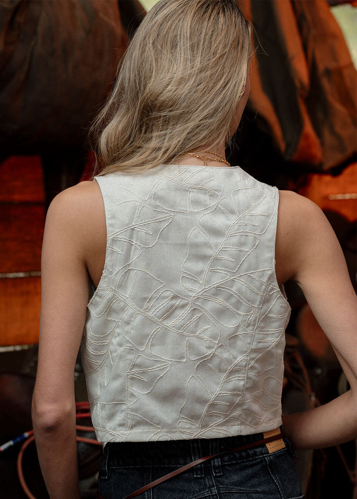 Camel-colored linen vest with a V-neckline, button placket, and sleeveless design.