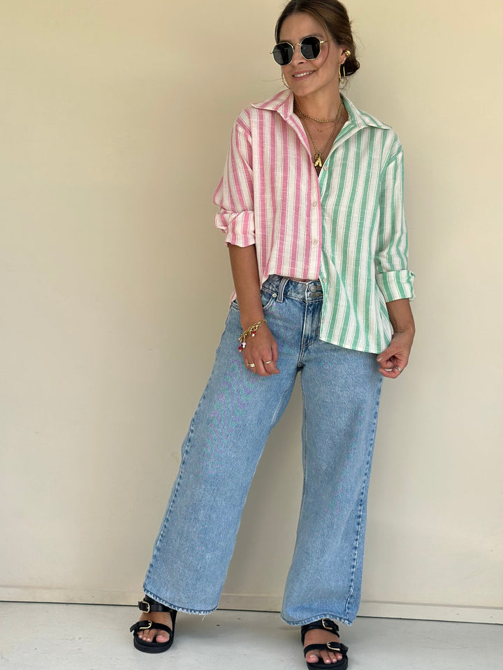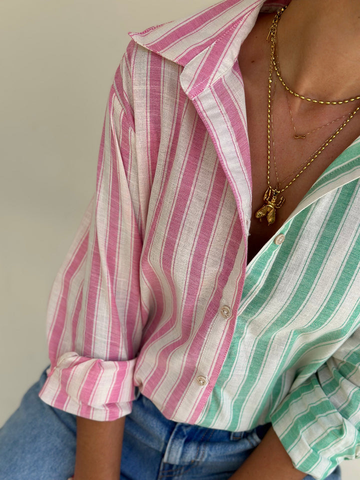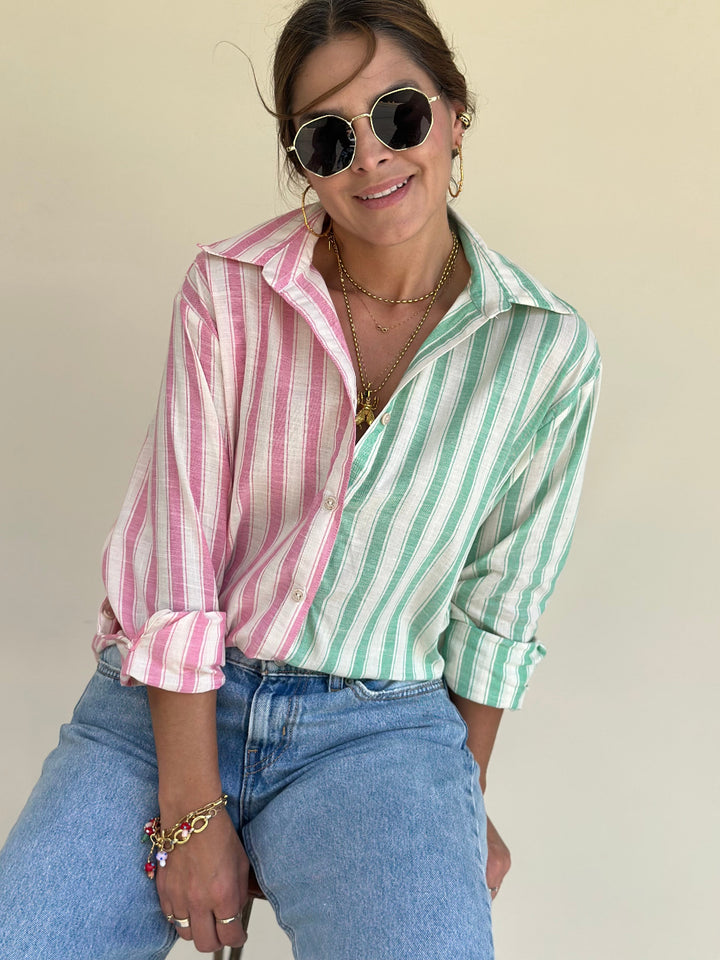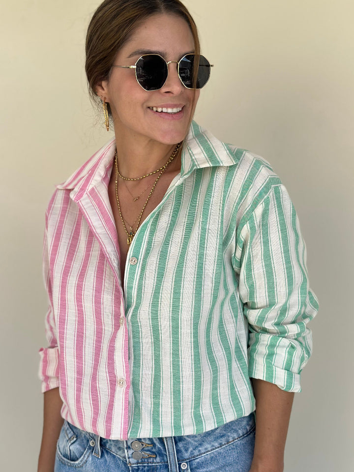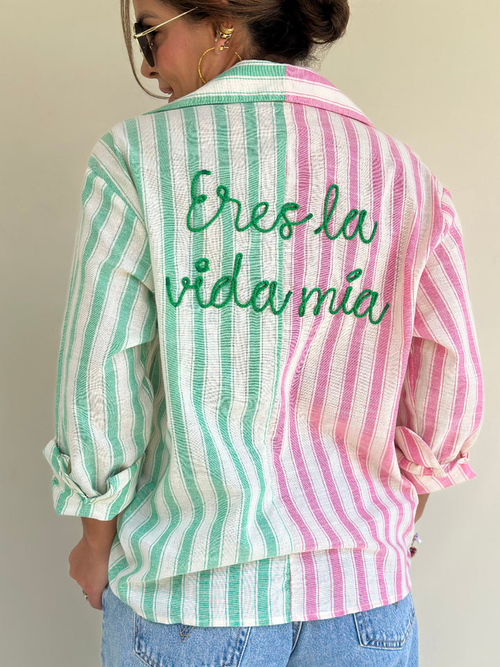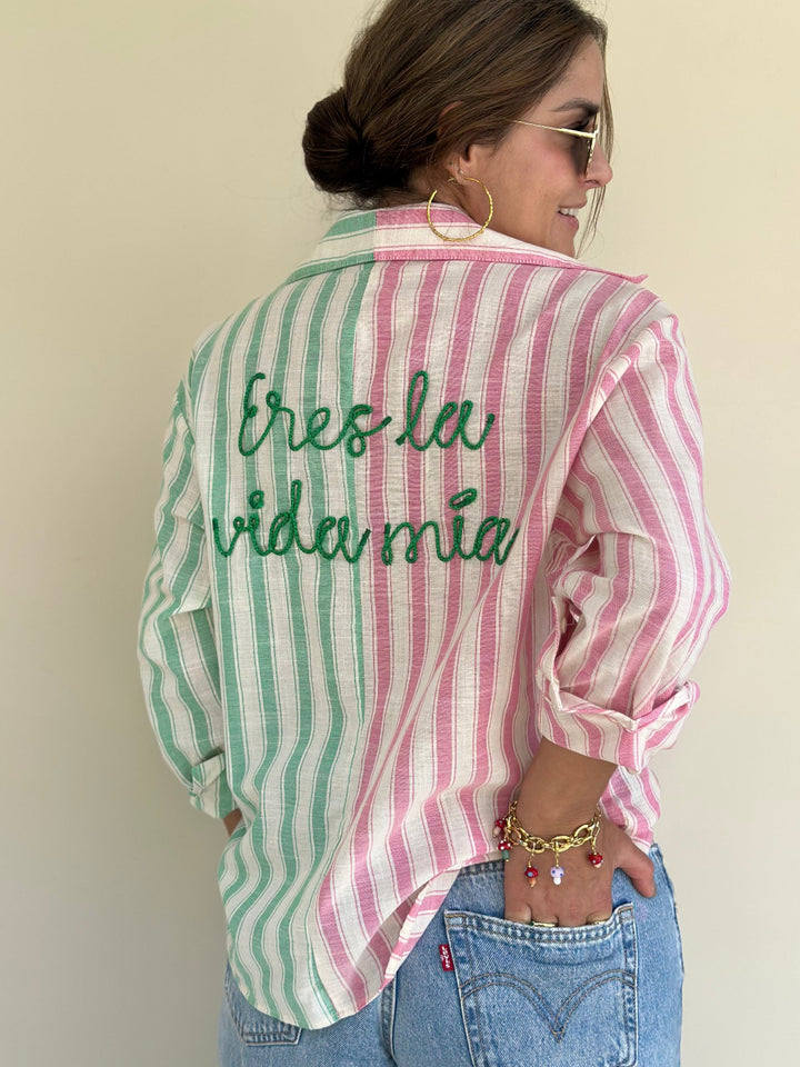 Effortlessly chic and full of personality, the Penélope Embroidered Shirt features a playful pink and green striped pattern in a lightweight cotton fabric. Designed with a classic collar, front button closure, and long sleeves, this relaxed-fit piece stands out with its back embroidery that reads “Eres la vida mía” — a reminder to live colorfully and from the heart. Perfect to style with denim or shorts for a laid-back, tropical-inspired look.