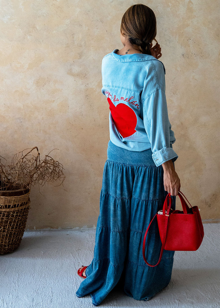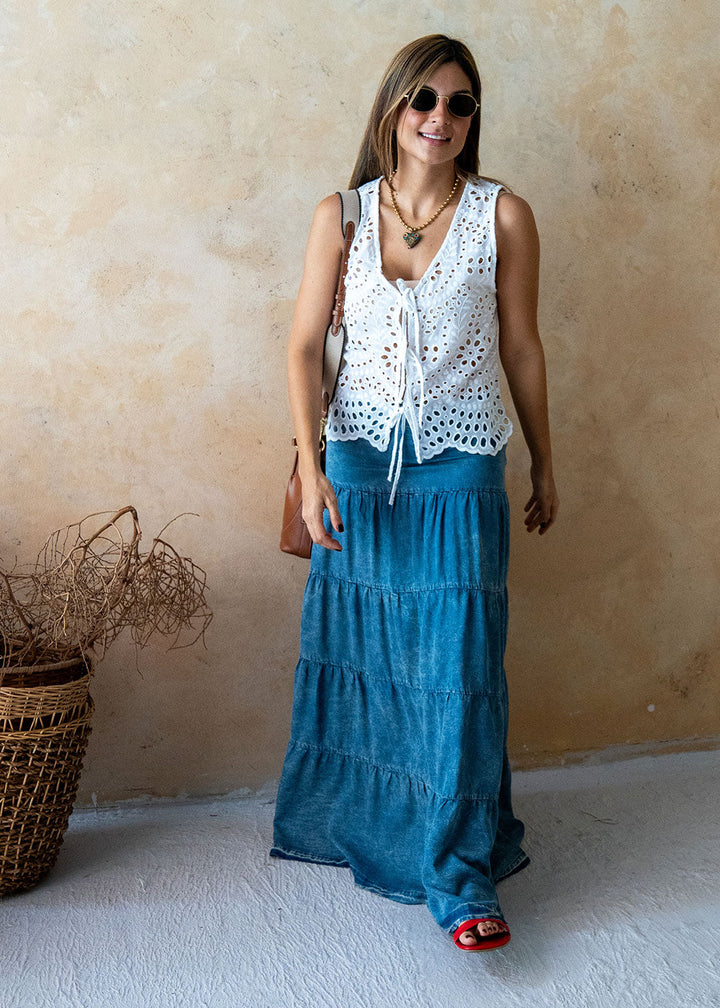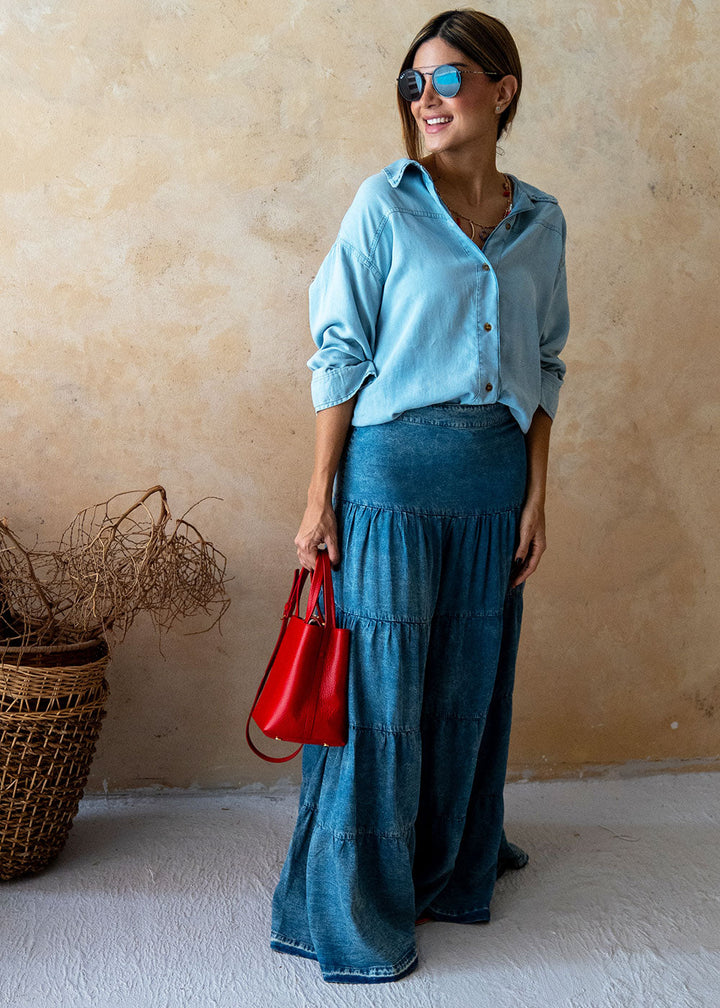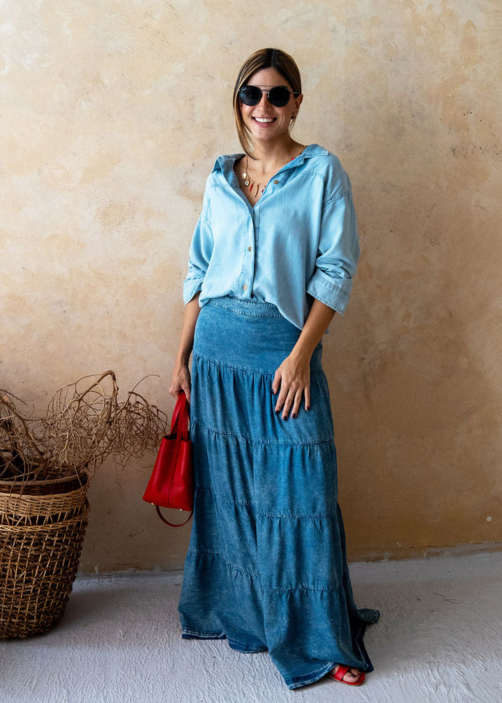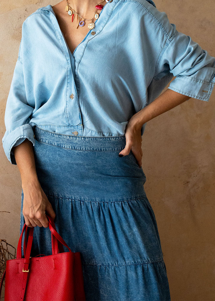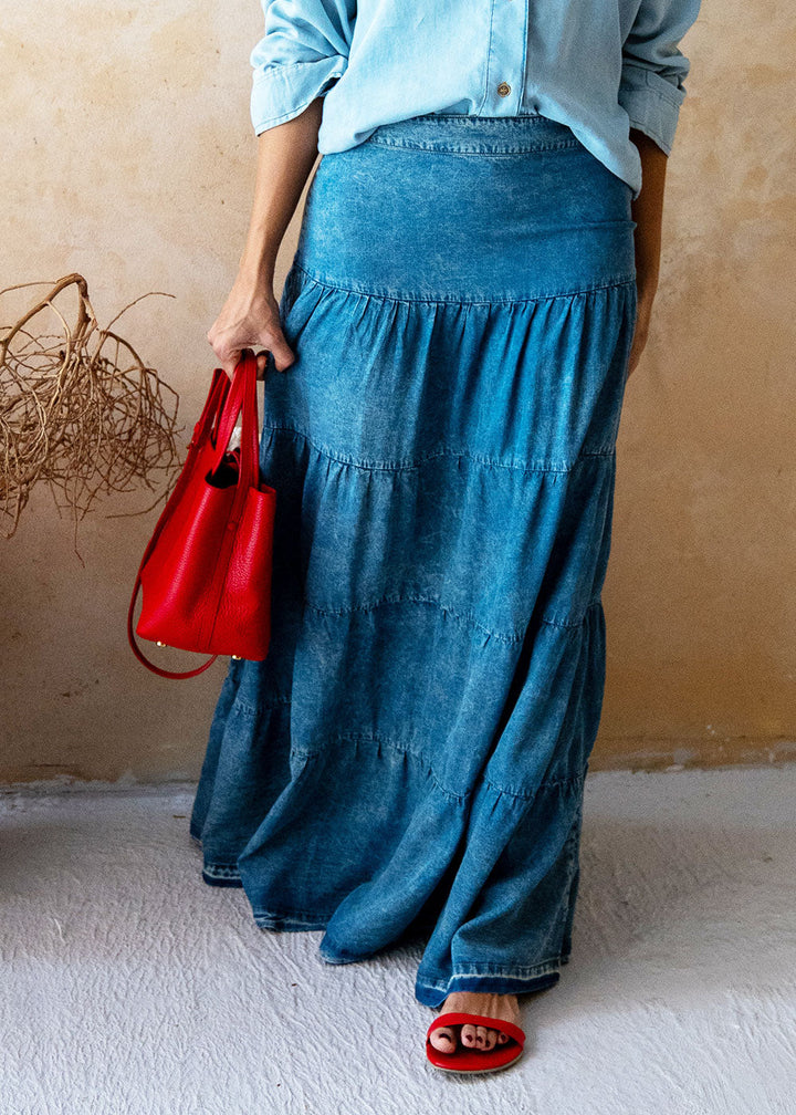Long chambray skirt in washed blue finish. Features gathered panel cuts and a side zipper on the left when worn. Silhouette: Fitted