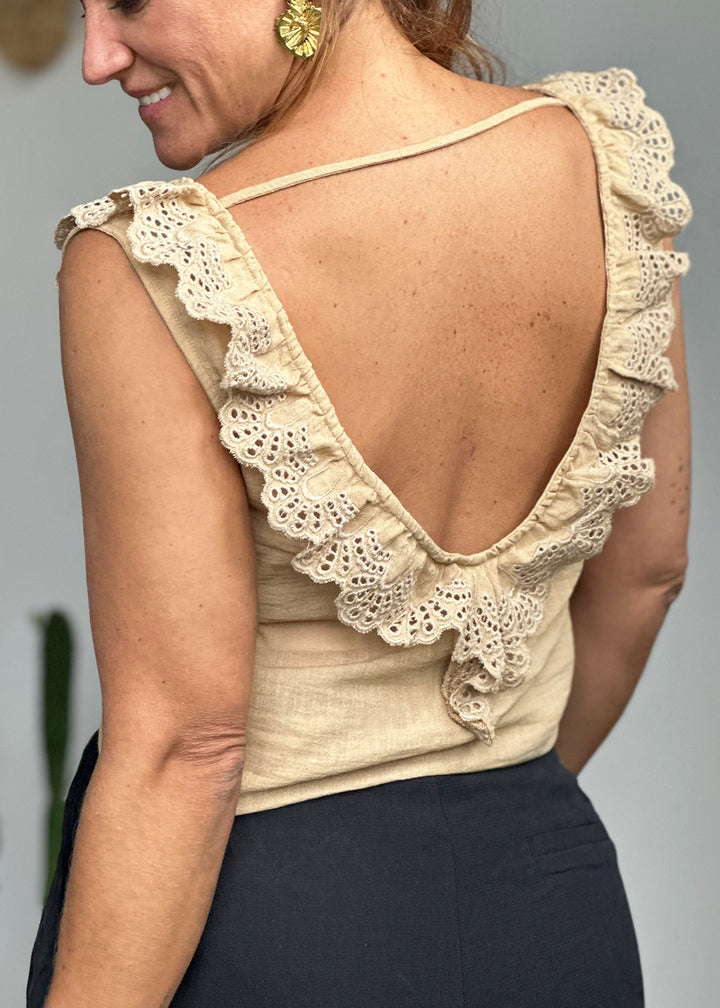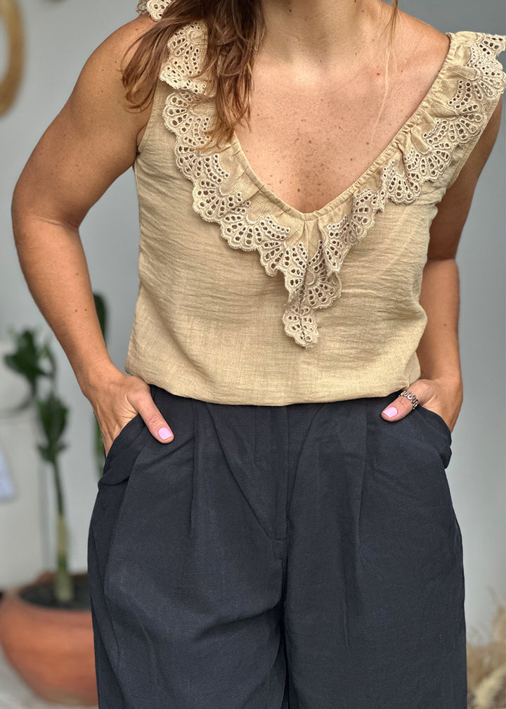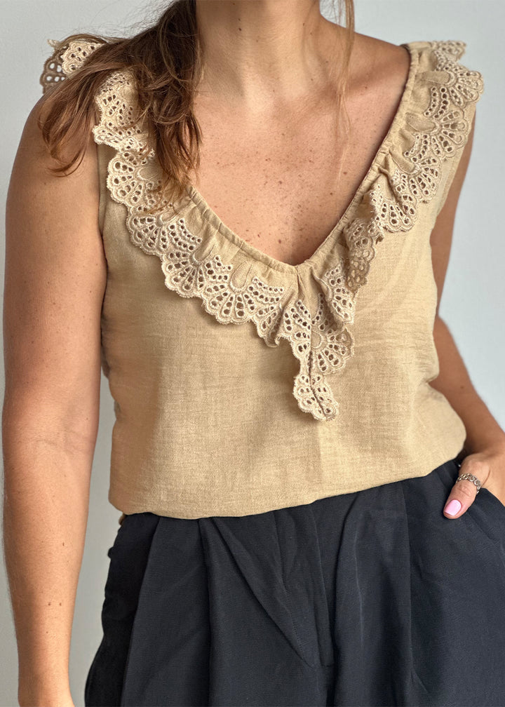 Camel Linen Blouse with Decorative Appliqué on the Front and Back Neckline and Sleeveless Design. It features a horizontal strap in the back to secure the neckline and side slits. Semi-fitted silhouette.