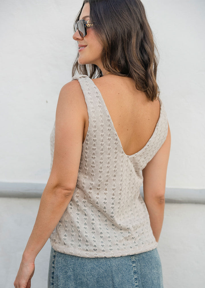 Lauren is an ivory knit sleeveless top featuring a V-neckline on the front and back and delicate shoulder details with an inner layer for extra comfort.
