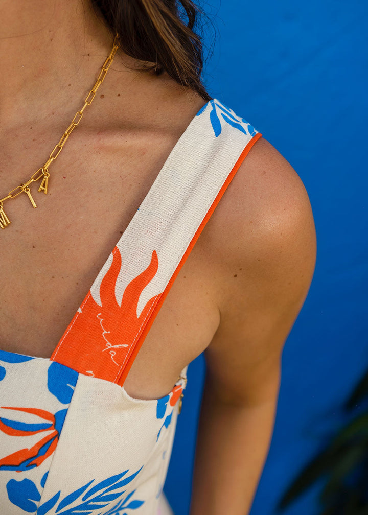 The Sixta Short Dress is the perfect blend of summer style and comfort. Crafted from a lightweight linen and viscose blend with a dynamic all-over print, its semi-fitted silhouette is both flattering and chic. It features wide trimmed straps, flattering bust/waist cuts, and functional pockets.
