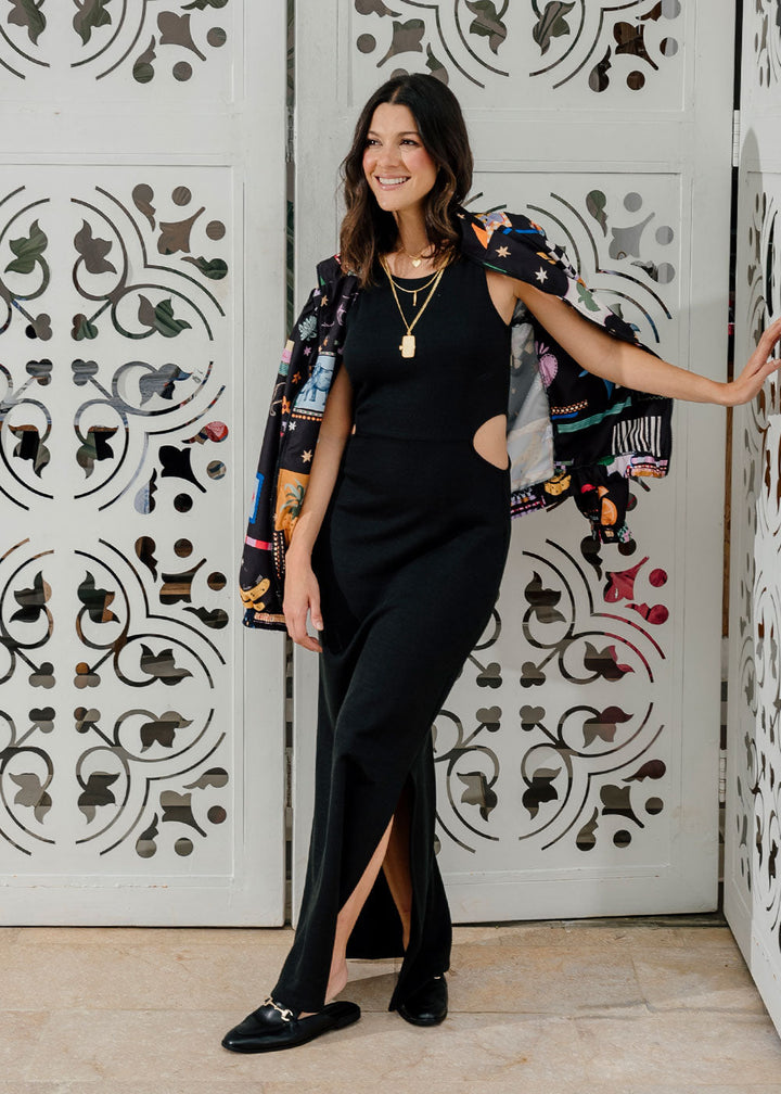 Loreta is a black rib-knit maxi dress with a round neckline, sleeveless design, and cut-outs at the waist and skirt.