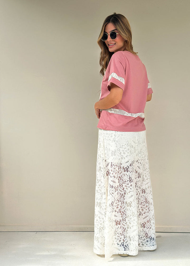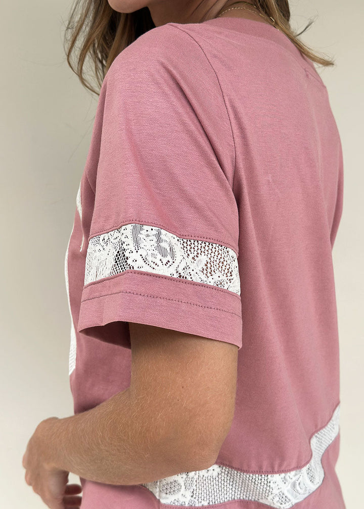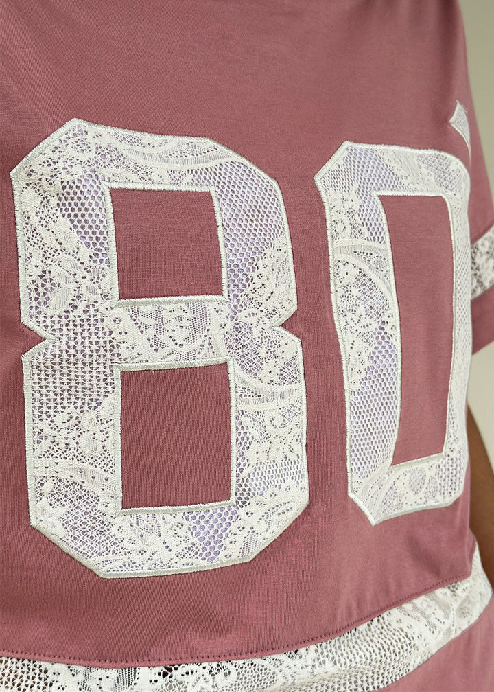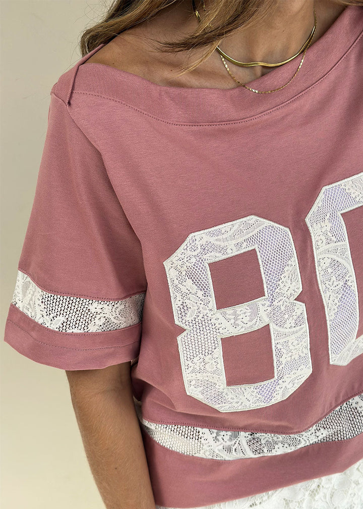 Brighten your wardrobe with this vibrant coral cotton knit top featuring an elegant boat neckline and distinctive lace-trimmed sleeves. The eye-catching embroidered patch at center front adds a playful artisan touch. Crafted in 100% premium cotton for breathable comfort and lasting quality.