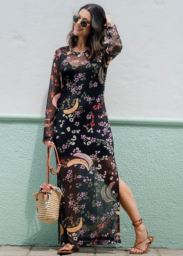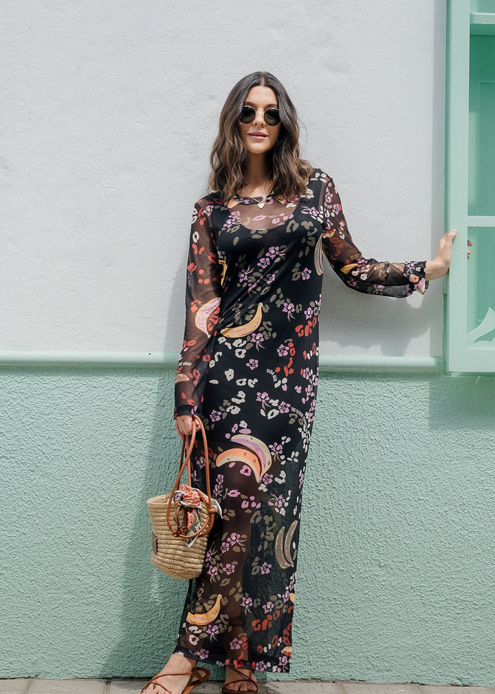 Pimienta is a long mesh printed dress featuring a round neckline, long sleeves, and side slits at the hem. Comes with a short inner slip dress.