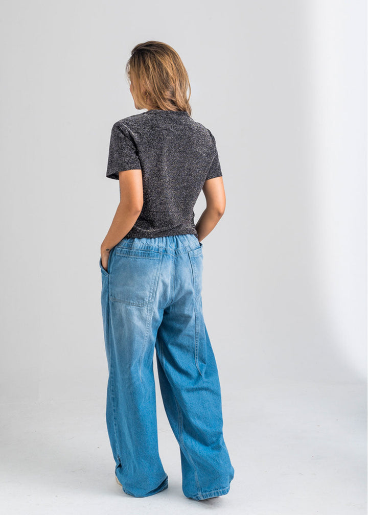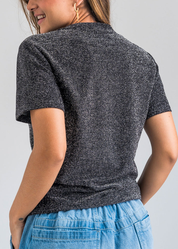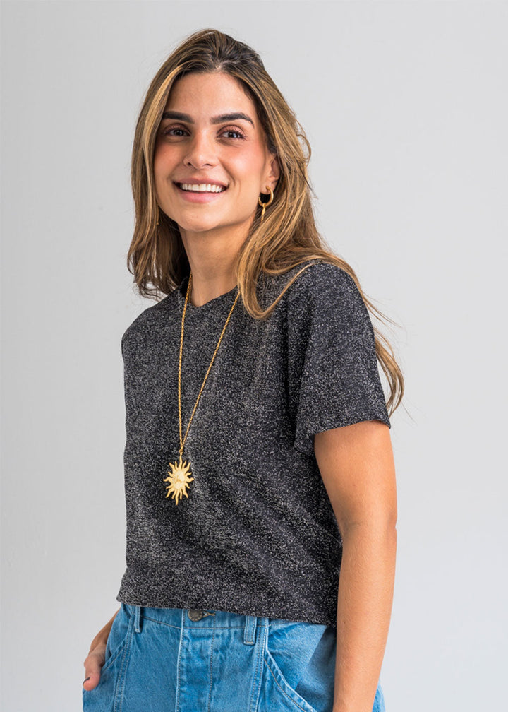 The Ania Lurex T-shirt offers comfort with a festive touch. Crafted from knit fabric with woven Silver Lurex threads, it provides a subtle, sophisticated sparkle. Its classic round neckline and short sleeves in a semi-fitted silhouette make it incredibly versatile. Easily elevate basic denim or layer it under an evening blazer. A chic, timeless piece, proudly made in Colombia.