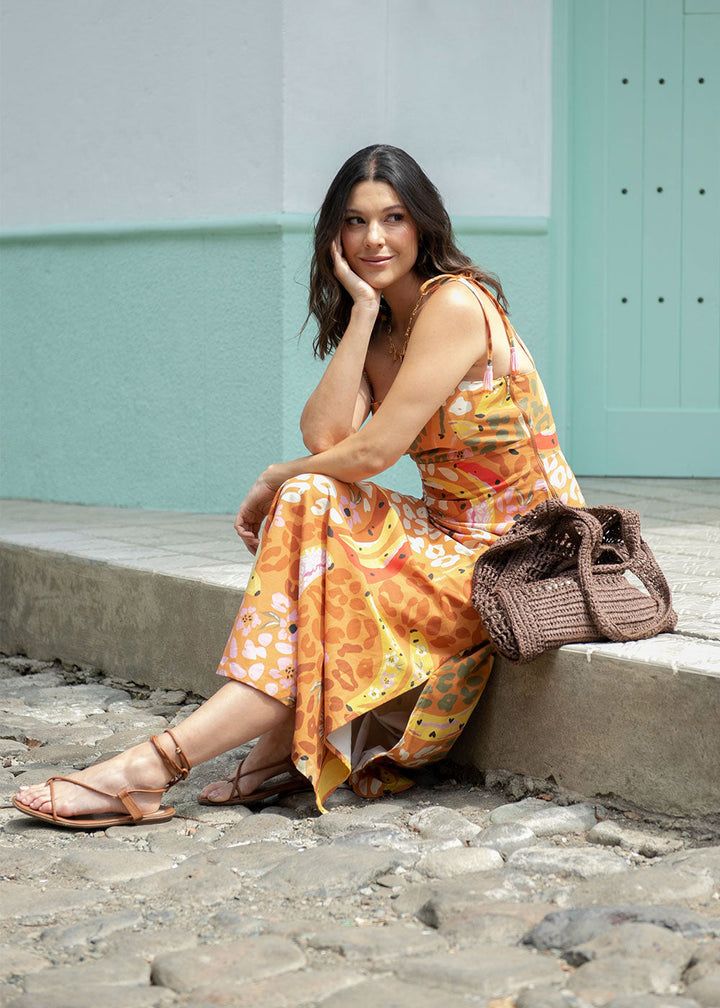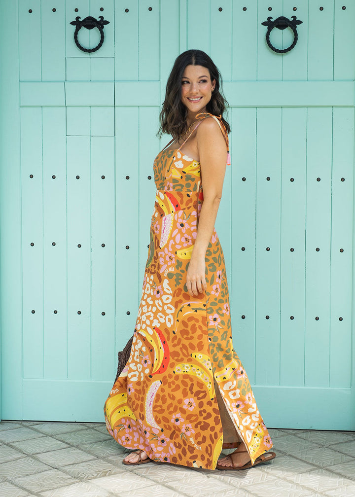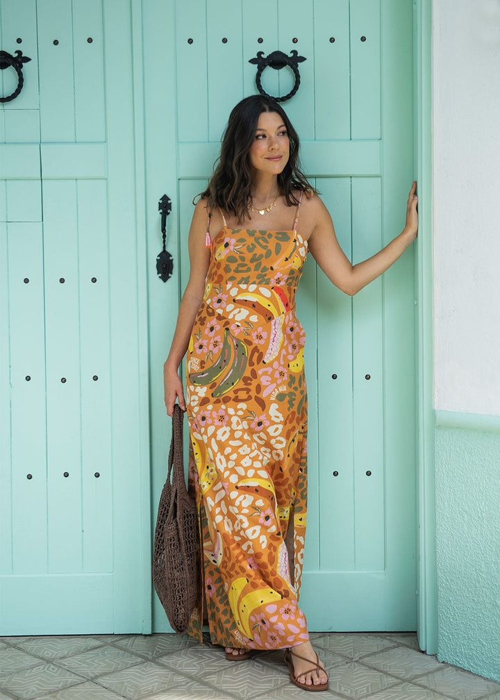 Sixtina is a flowing linen-effect maxi dress with an all-over animal print. Features thin adjustable tie straps with beaded tassels, bust and waist paneling, side zipper, and functional pockets.