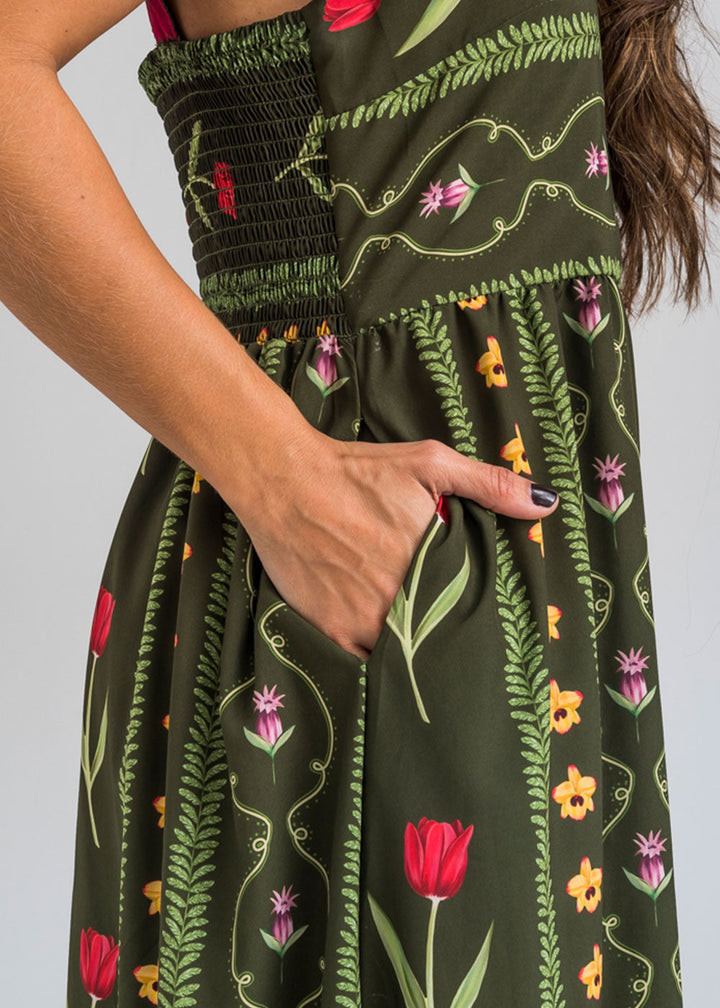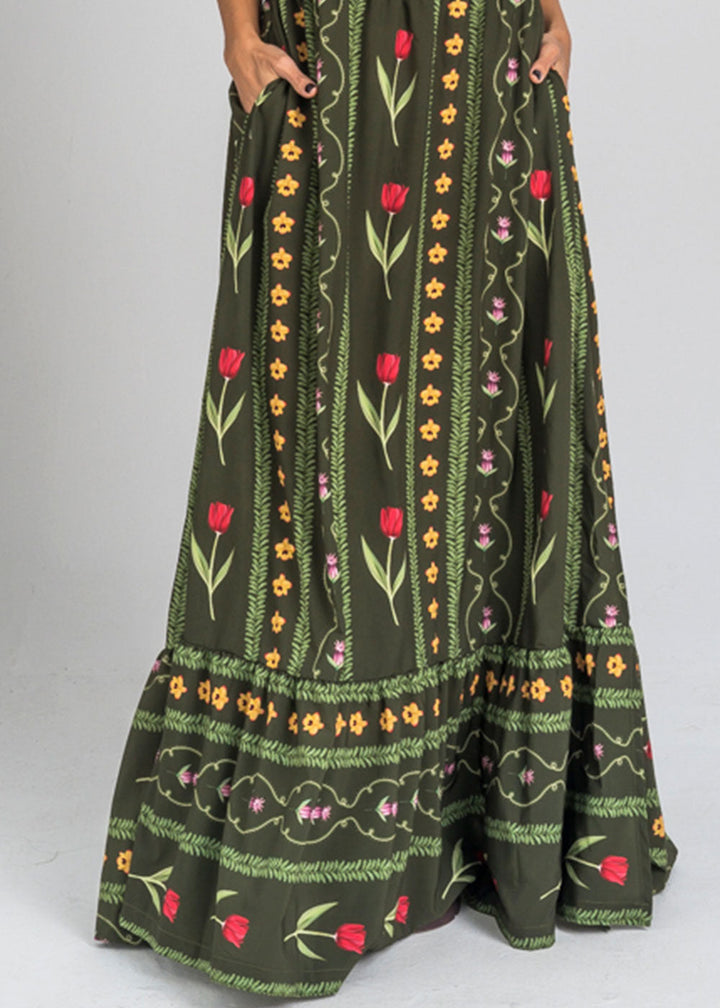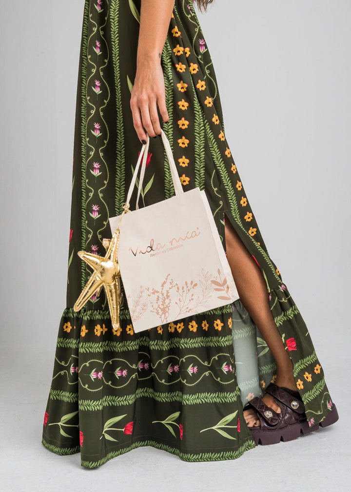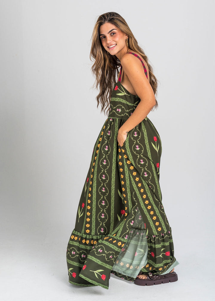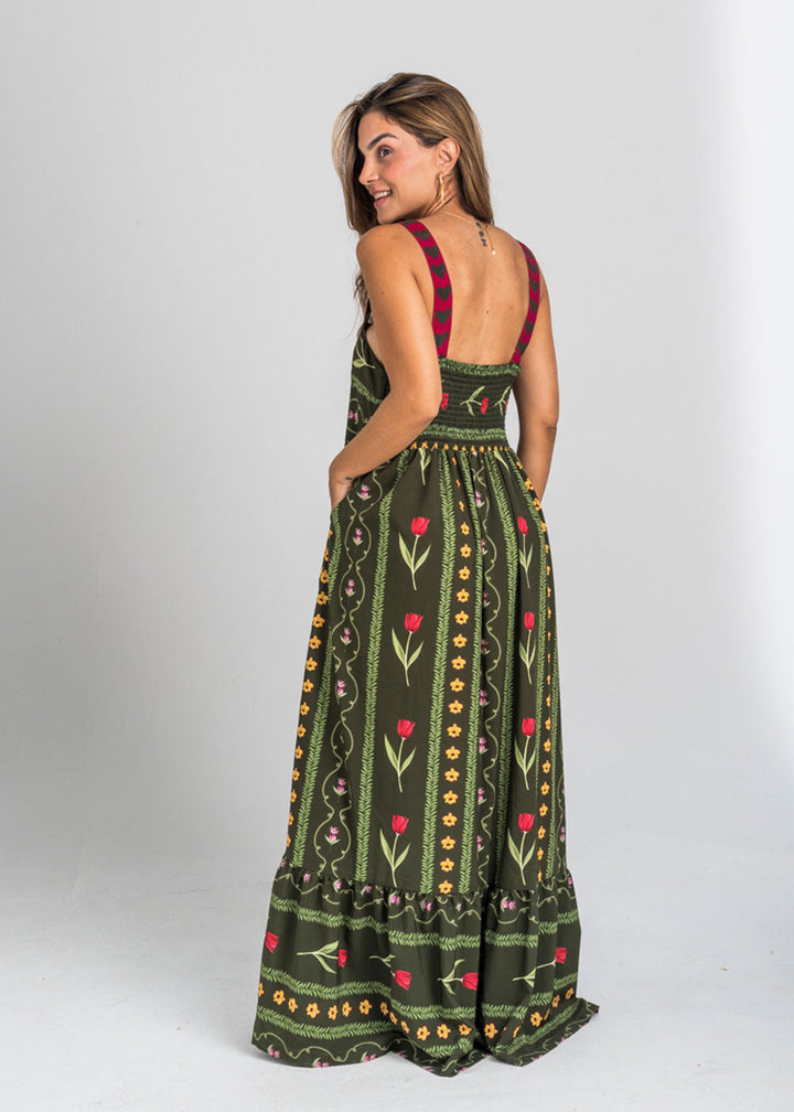The Serenidad Maxi Dress embodies feminine grace and summer charm. A long dress crafted from soft challis with a vibrant, tropical all-over print. The silhouette features a flattering princess cut, wide straps, and a comfortable shirred back for an adjustable fit. Perfect for warm-weather events, beach weddings, or tropical vacations.