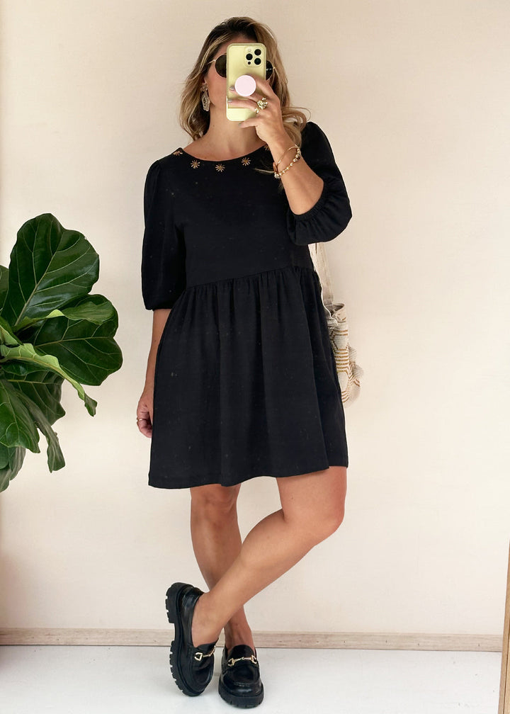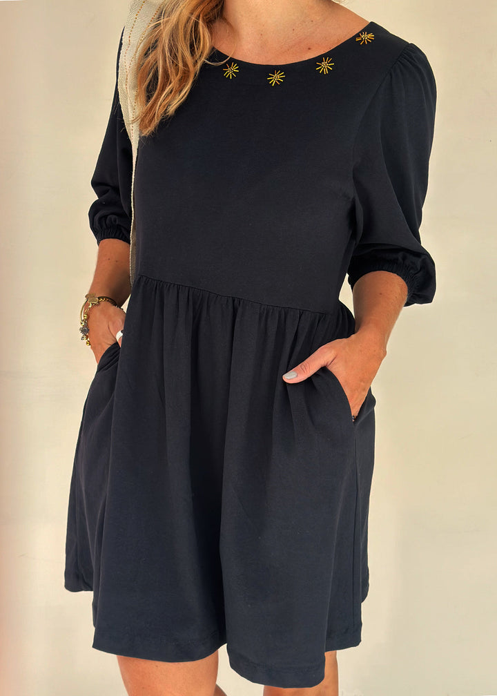 Short dress in black knit fabric. Round neckline with embroidery, back with an opening and buttons, 3/4 sleeves with elastic cuffs, gathered waist, and functional side pockets.