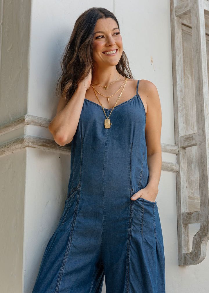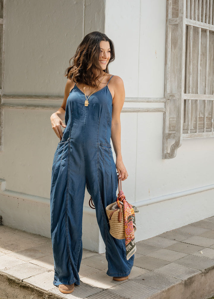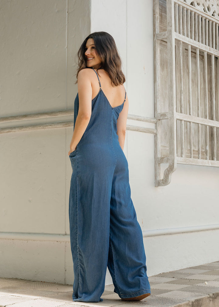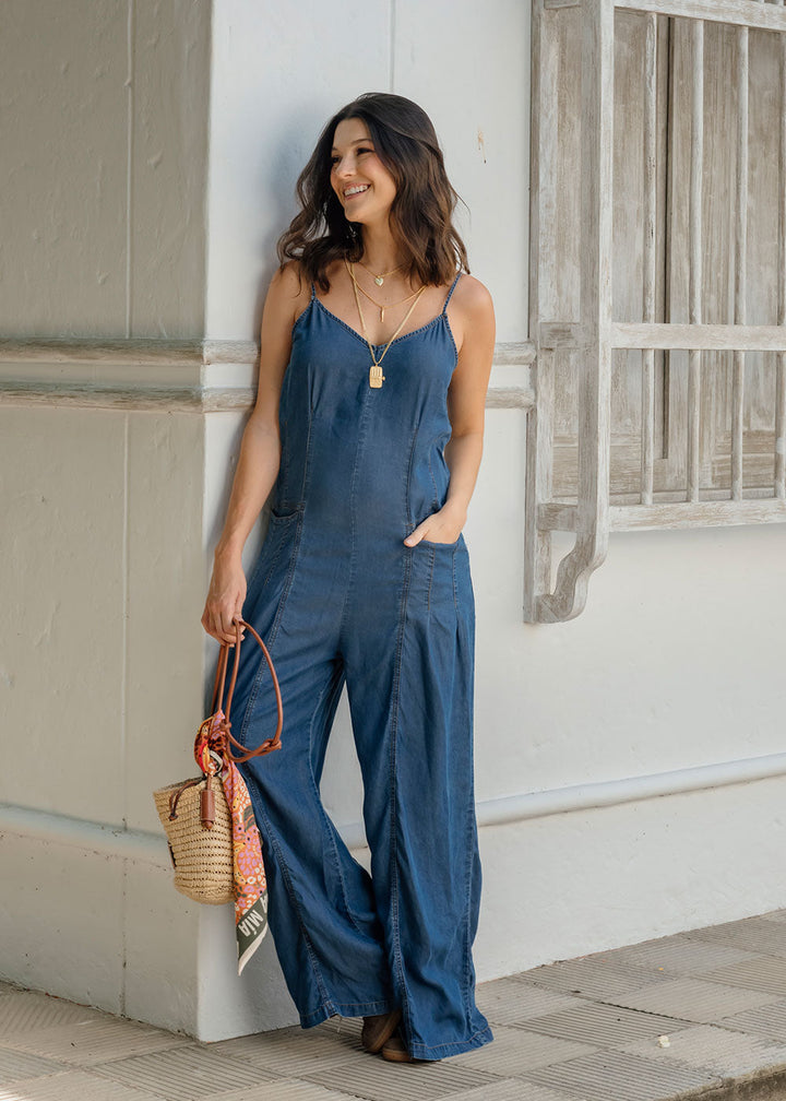 Vicenta is a long blue Tencel jumpsuit with a soft-washed finish that creates a fluid, fresh drape. Designed with thin adjustable straps, a V-neckline on the front and back, and functional front pockets with subtle darts for structure.